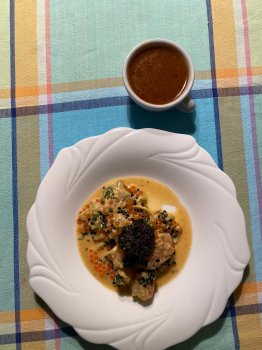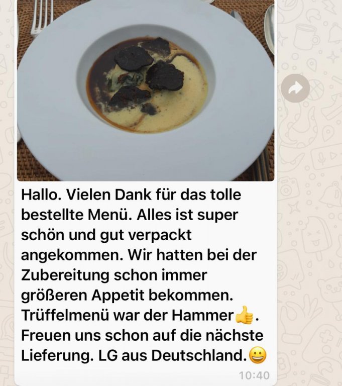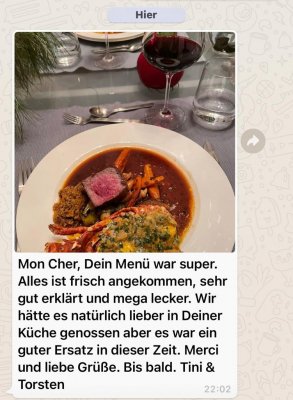 Wir haben bei David ein Menue für 5 Personen bestellt, um ein Stückchen Frankreich Feeling nach Hause zu holen. Das große Packet kam wie abgesprochen pünktlich bei uns an. Die vorbereiteten Köstlichkeiten waren portioniert, vakuumiert und gekühlt eingepackt. Eine ausführliche Anleitung zur Fertigstellung des Menue lag dem Packet bei, sowie ein persönlicher Gruß aus seiner Küche.